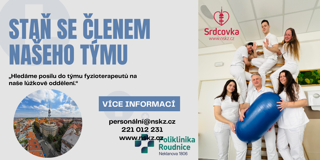 Přihlásit se k zaslání zprávyHledáme posilu do týmu fyzioterapeutů na naše lůžkové oddělení. Nabízíme práci, která má smysl – individuální přístup k pacientům, přátelskou atmosféru a možnost růstu v prostředí moderního zdravotnického zařízení v centru Prahy.